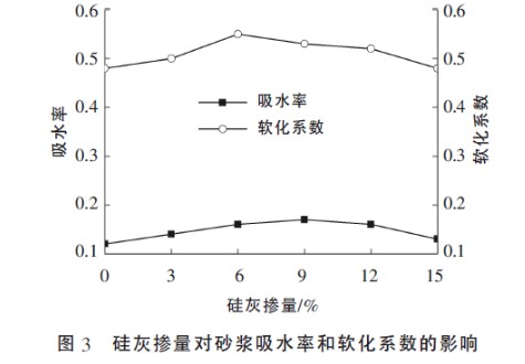 (3)當(dāng)硅灰摻量逐漸增加時(shí),石膏基自流平砂漿的吸水率和軟化系數(shù)呈先上升后下降的趨勢(shì),且當(dāng)硅灰摻量為6%時(shí),石膏基自流平砂漿的耐水性達(dá)到最優(yōu)。
