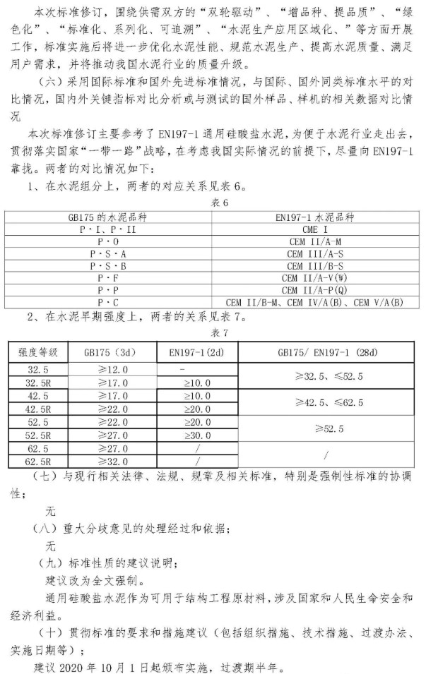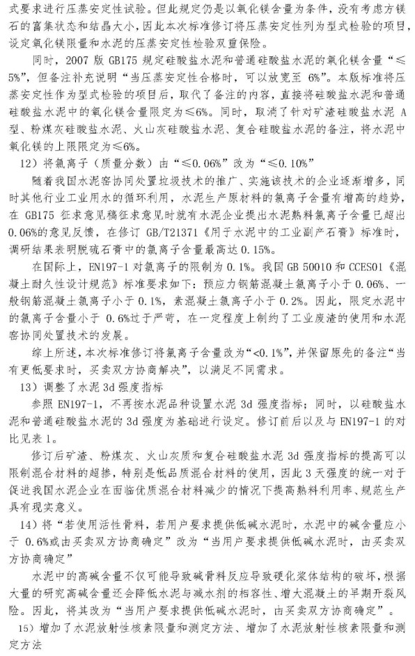 日前,工信部網(wǎng)站發(fā)布了《平板玻璃》等19項(xiàng)強(qiáng)制性國家標(biāo)準(zhǔn)報(bào)批公示,公示時間是2020年4月30日-2020年5月29日,計(jì)劃編號為20131158-Q-609的通用硅酸鹽水泥代替標(biāo)準(zhǔn)是GB 175-2007,建議2020年10月1日頒布實(shí)施,過渡期為6個月(見修訂說明)。1、將“條文強(qiáng)制”修訂為“全文強(qiáng)制“3、對水泥組分進(jìn)行細(xì)化和調(diào)整5、取消了復(fù)合硅酸鹽水泥的32.5(R)強(qiáng)度等級6、將氯離子由“≤0.06%“改為“≤0.10%“7、調(diào)整了水泥3d強(qiáng)度指標(biāo)8、將普通硅酸鹽水泥的細(xì)度表征改為“以篩余表示”9、其它變化詳見修訂說明..................